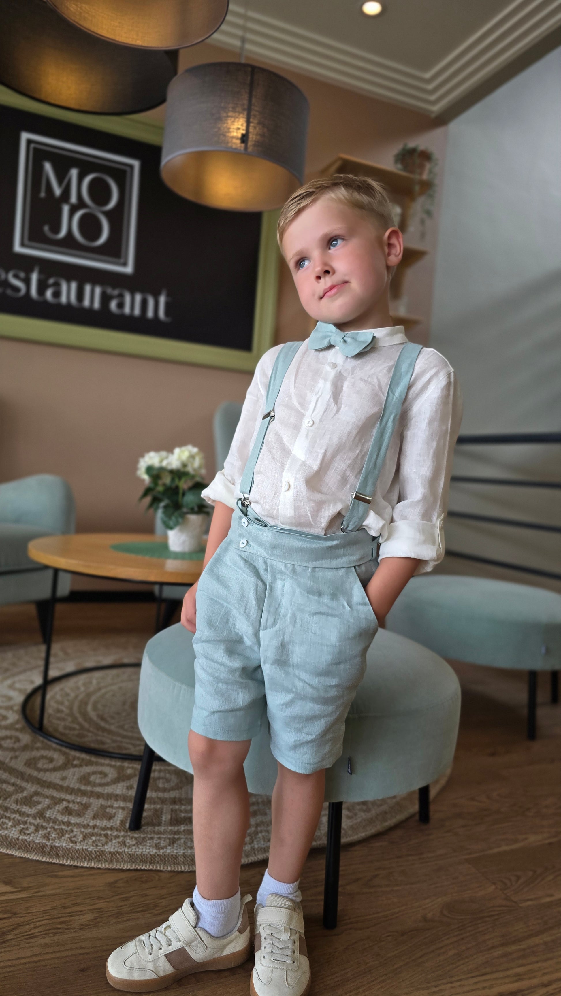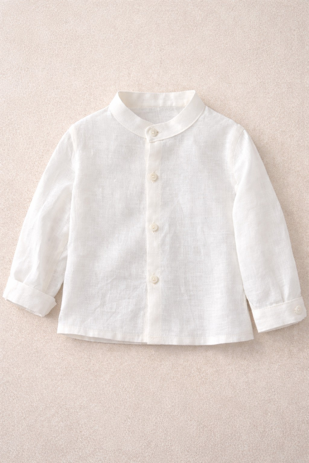 Elegantiški marškiniai berniukams, pasiūti iš 100 % lino – natūralaus, lengvo ir kvėpuojančio audinio, puikiai tinkančio šiltoms dienoms. Modelis su mao apykakle, sagų užsegimu priekyje ir ilgomis rankovėmis su sagutėmis, kurias galima atlenkti laisvesniam stiliui.
