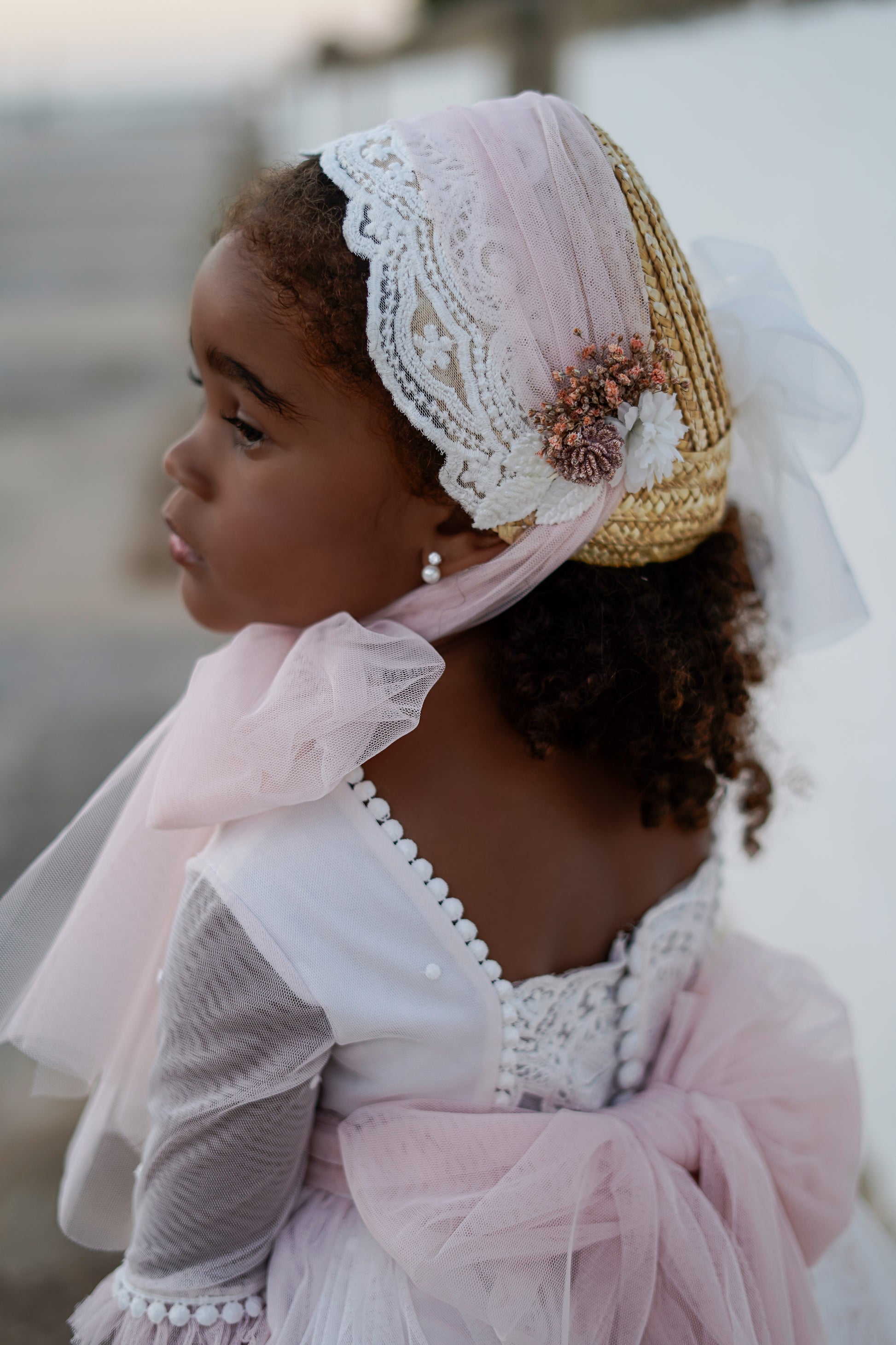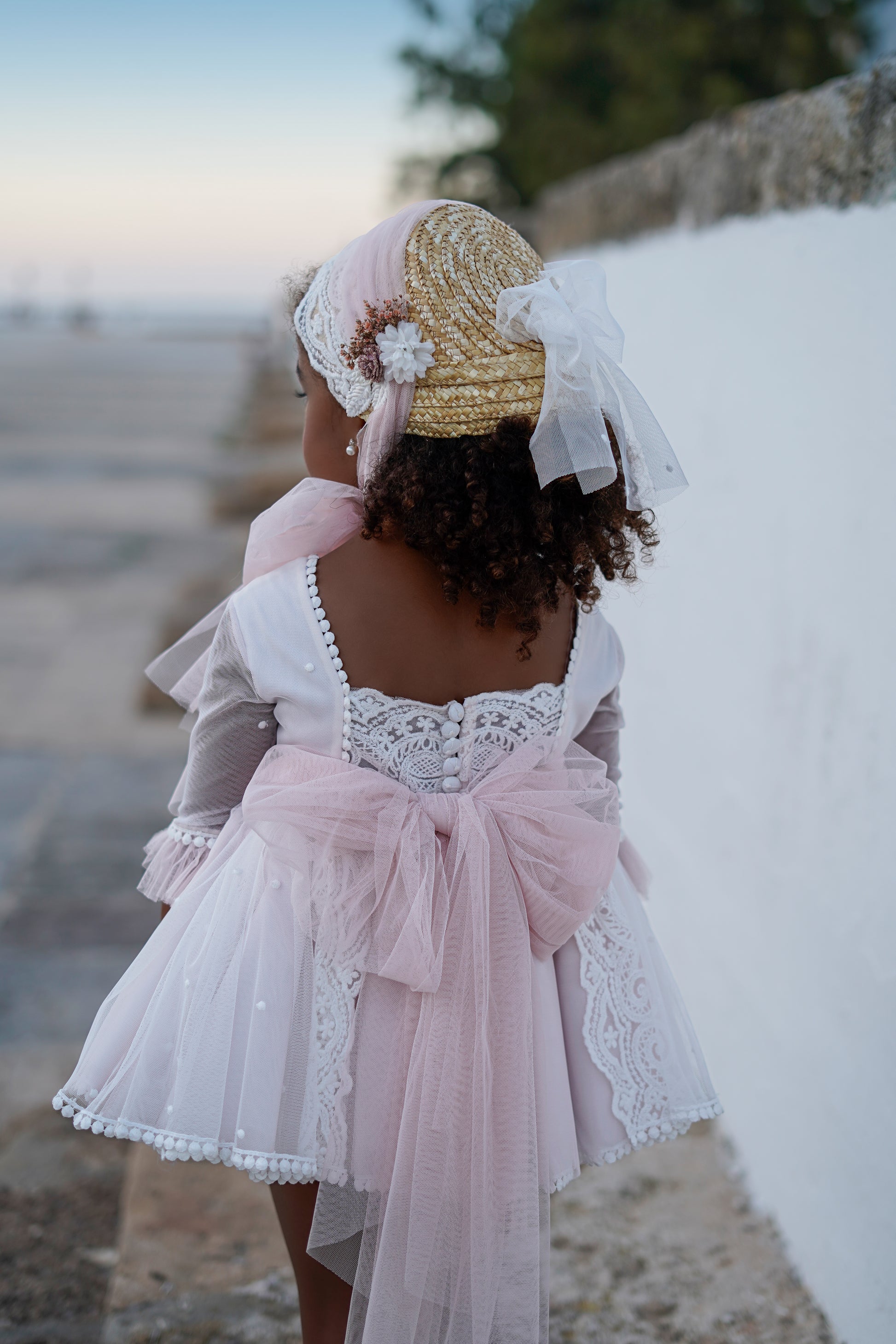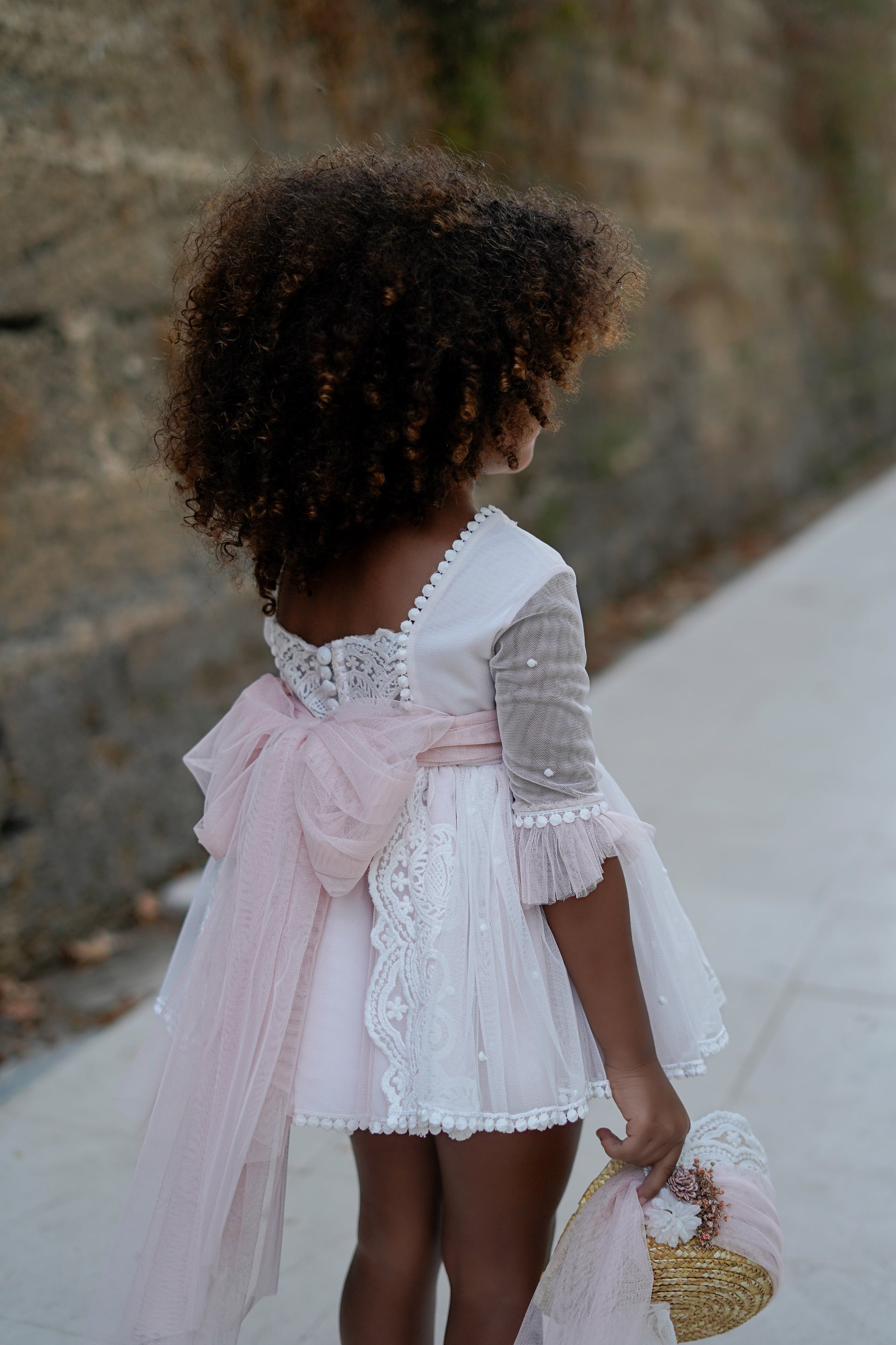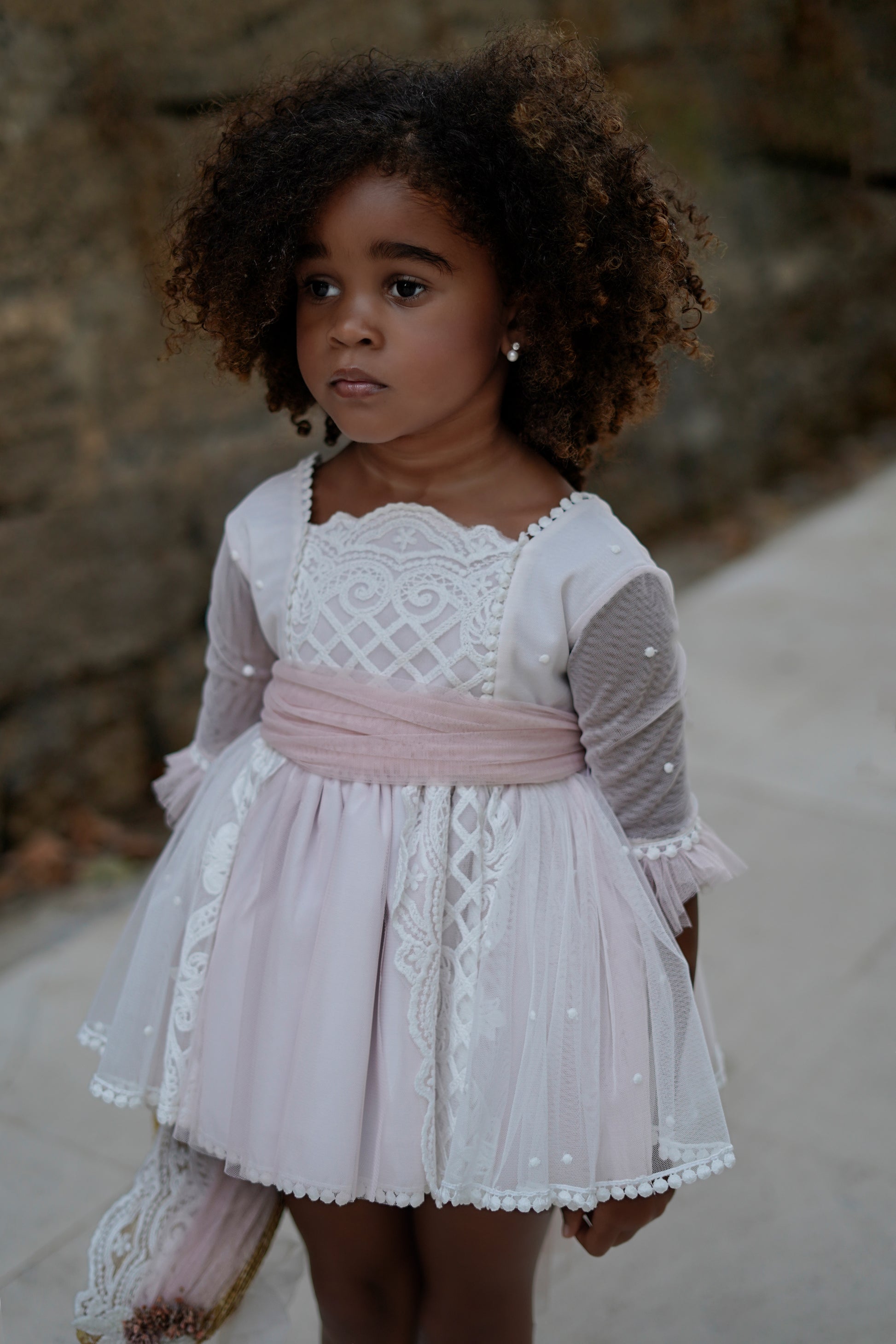 Subtili vaikiška ceremoninė suknelė pudros rožinės spalvos, su smulkiais nėriniais puošta viršutine dalimi, tiulio rankovėmis ir 5 sluoksnių raukinių sijonu, suteikiančiu apimties ir lengvo judesio. Nugaroje suknelė užsegama elegantiškomis sagomis, kurios suteikia rafinuotą ir tvarkingą apdailą.