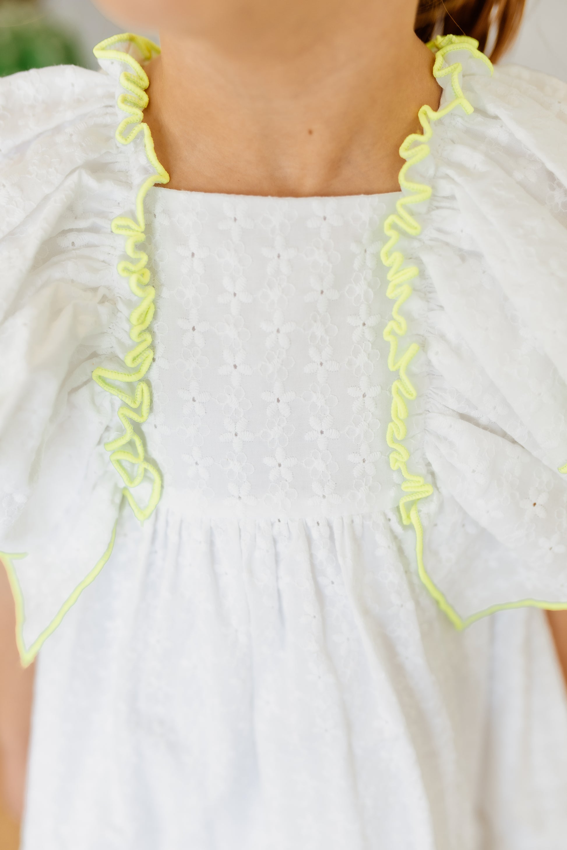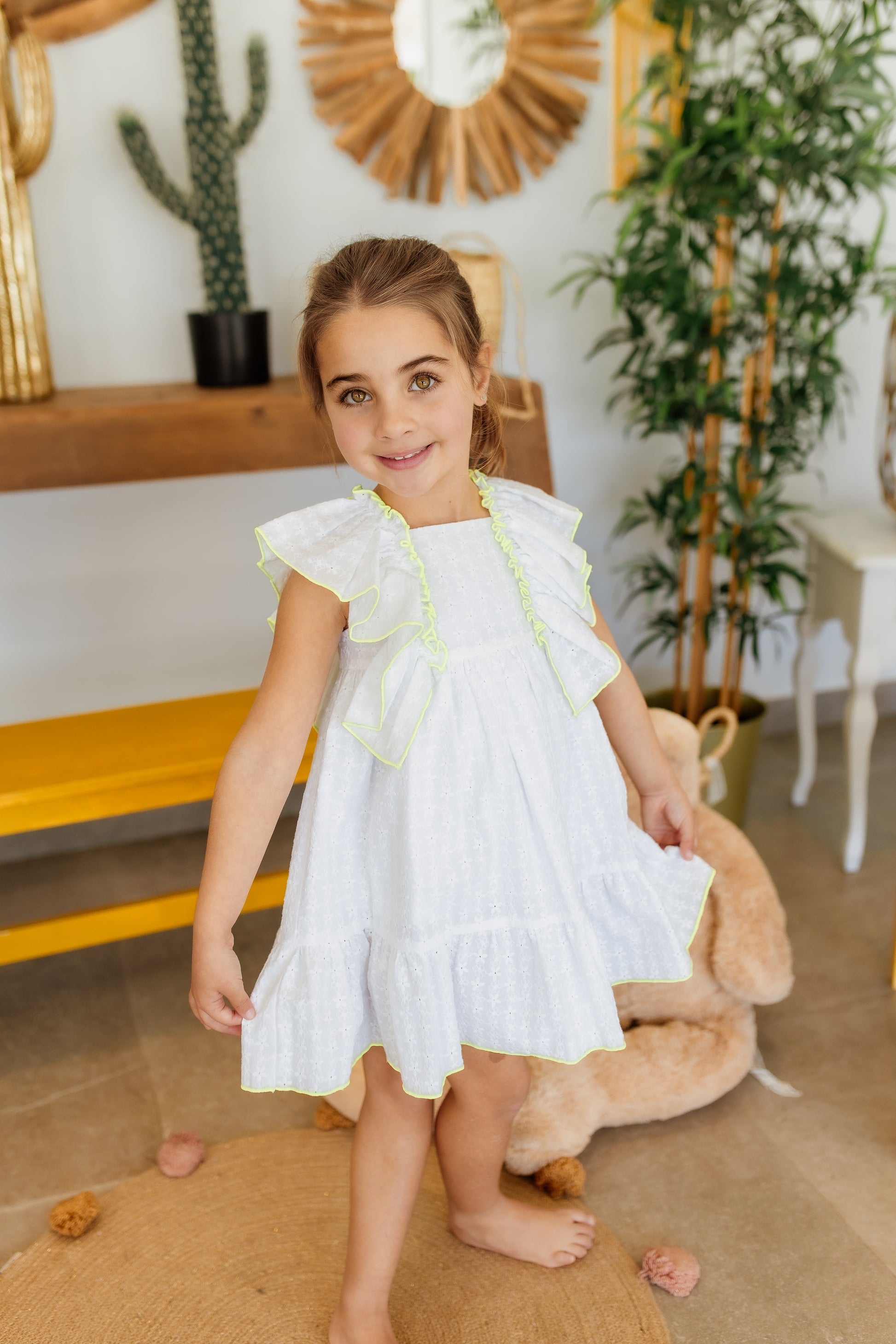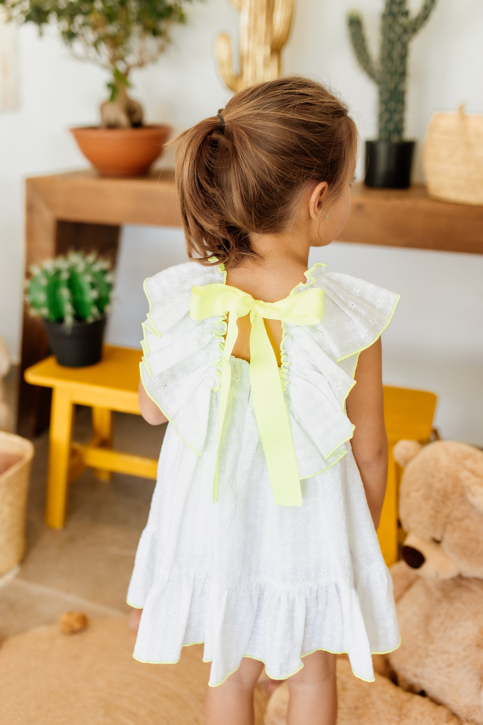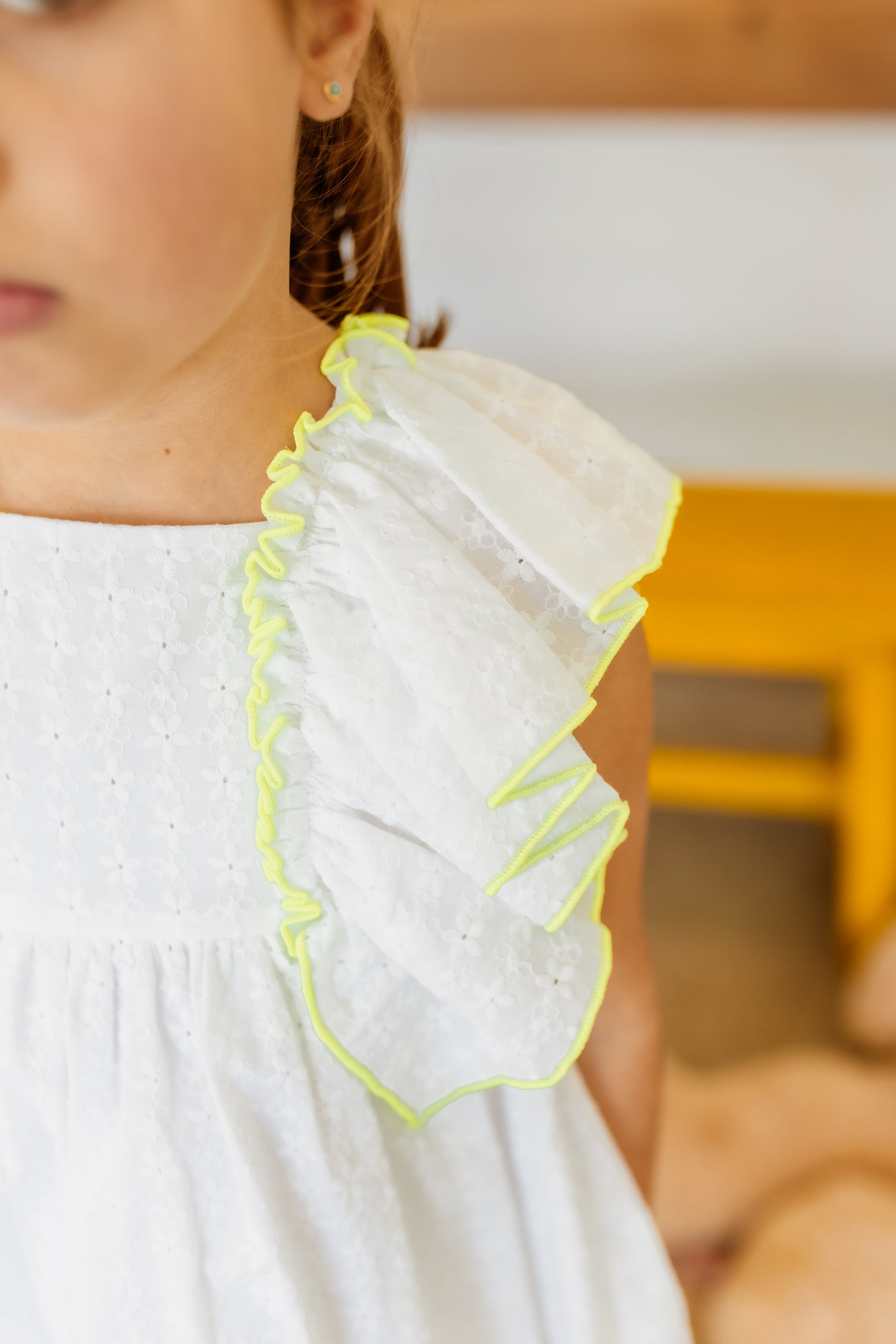 Ši elegantiška balta vasarinė suknelė mergaitėms spindi subtilumu ir žaismingumu. Dekoruota baltomis gėlytėmis ir išryškinta kontrastingomis geltonomis siūlėmis, ji idealiai tinka tiek kasdienai, tiek šventinėms progoms. Švelnus audinys ir lengvas siluetas užtikrina komfortą visą dieną, o raukiniai suteikia ypatingo žavesio. Puikus pasirinkimas vasaros nuotykiams ar pasivaikščiojimams saulėtą dieną!