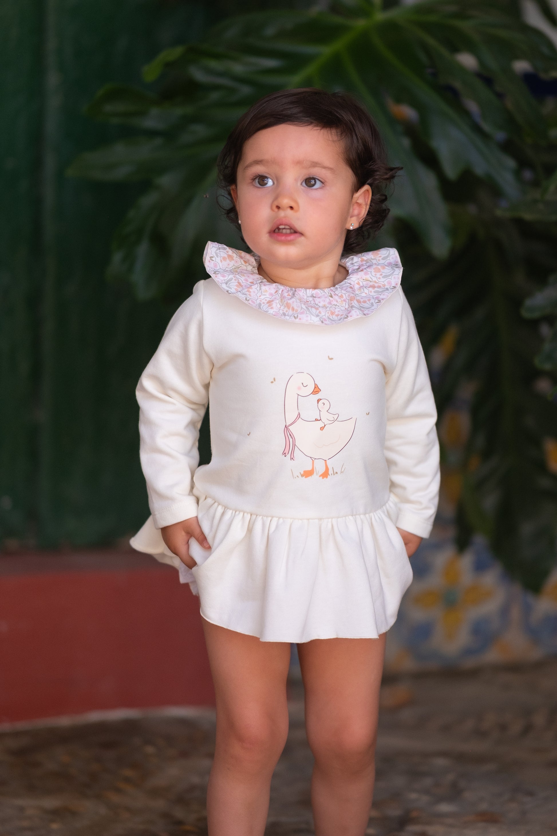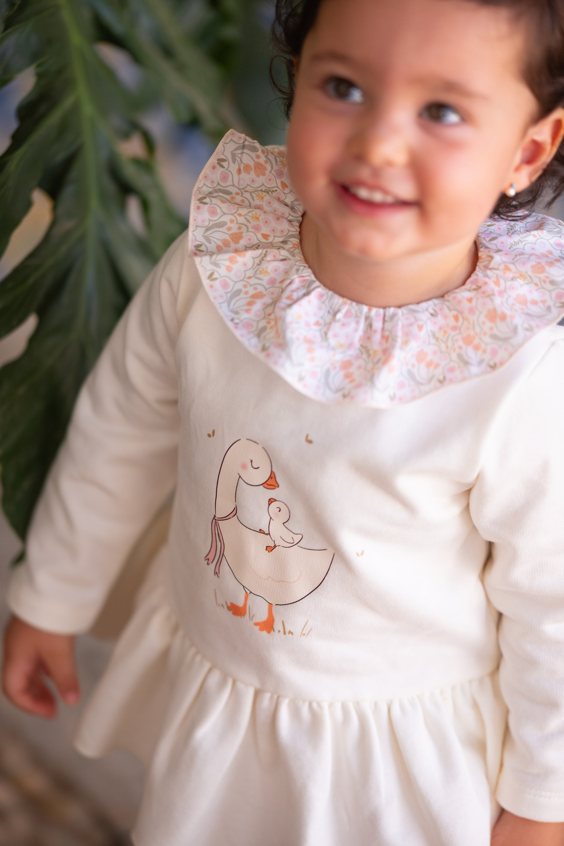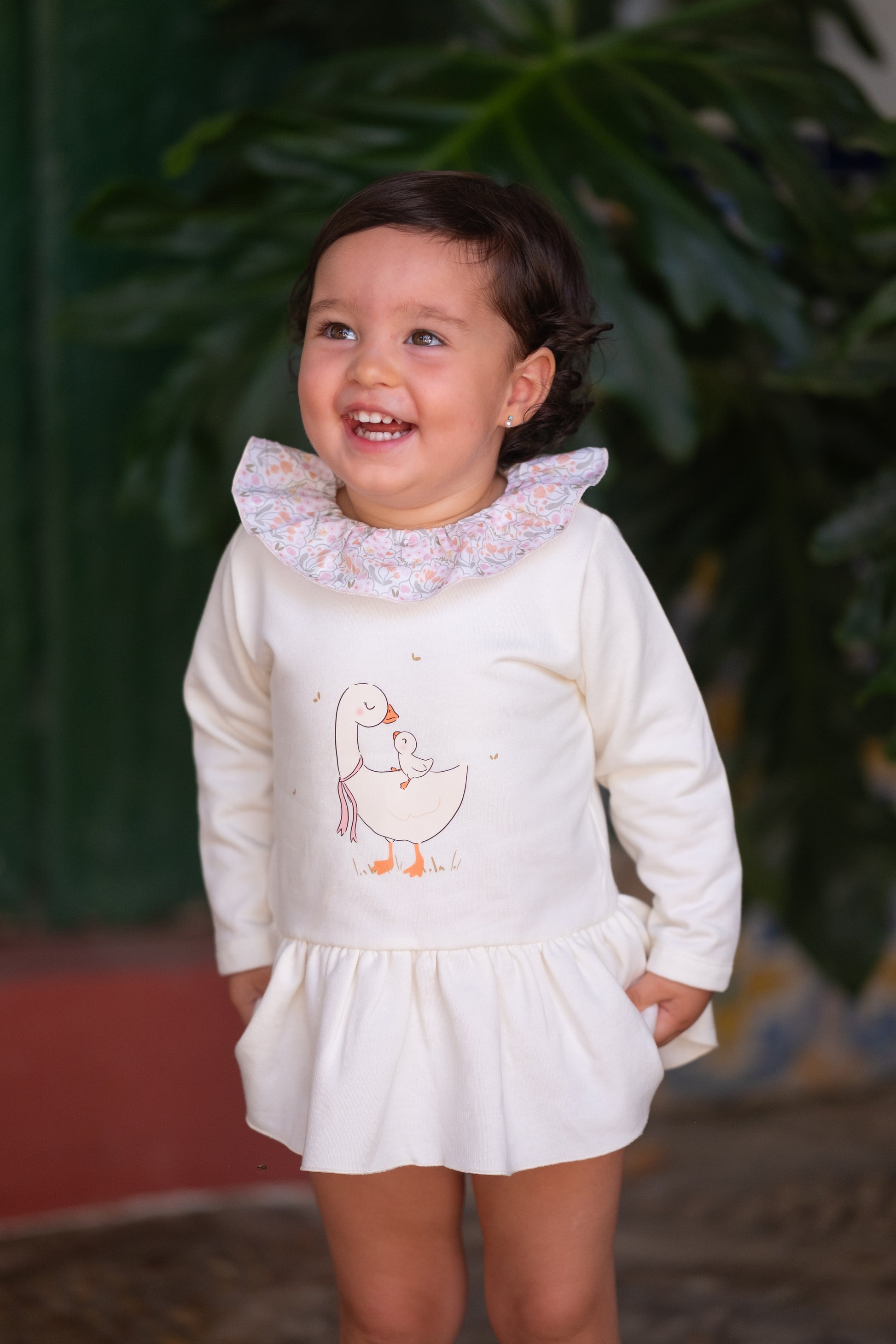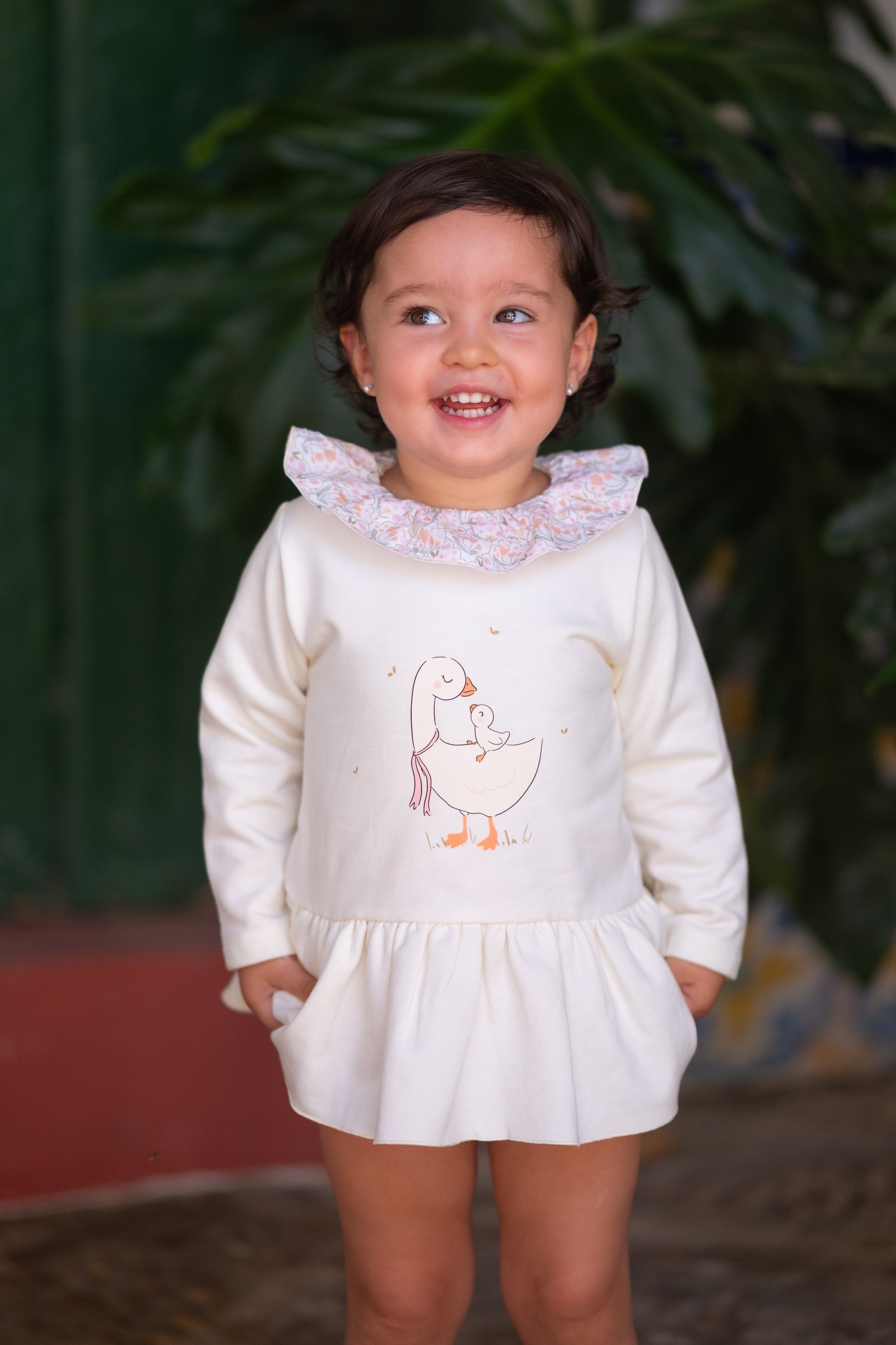 Žavingas komplektas mergaitei –baltos spalvos džemperiukas–suknelė su žąselės spauda ir gėlių rašto apykakle. Vidinė pusė dengta minkštu veliūriniu audiniu, kuris suteikia šilumos ir komforto. Priderintos kelnaitės iš tos pačios medžiagos kaip ir apykaklė, sukuriant vientisą ir žavingą įvaizdį. Pagamintas iš audinio (50% medvilnė, 50% poliesteris). Puikus pasirinkimas jaukiam ir stilingam kasdieniam įvaizdžiui.