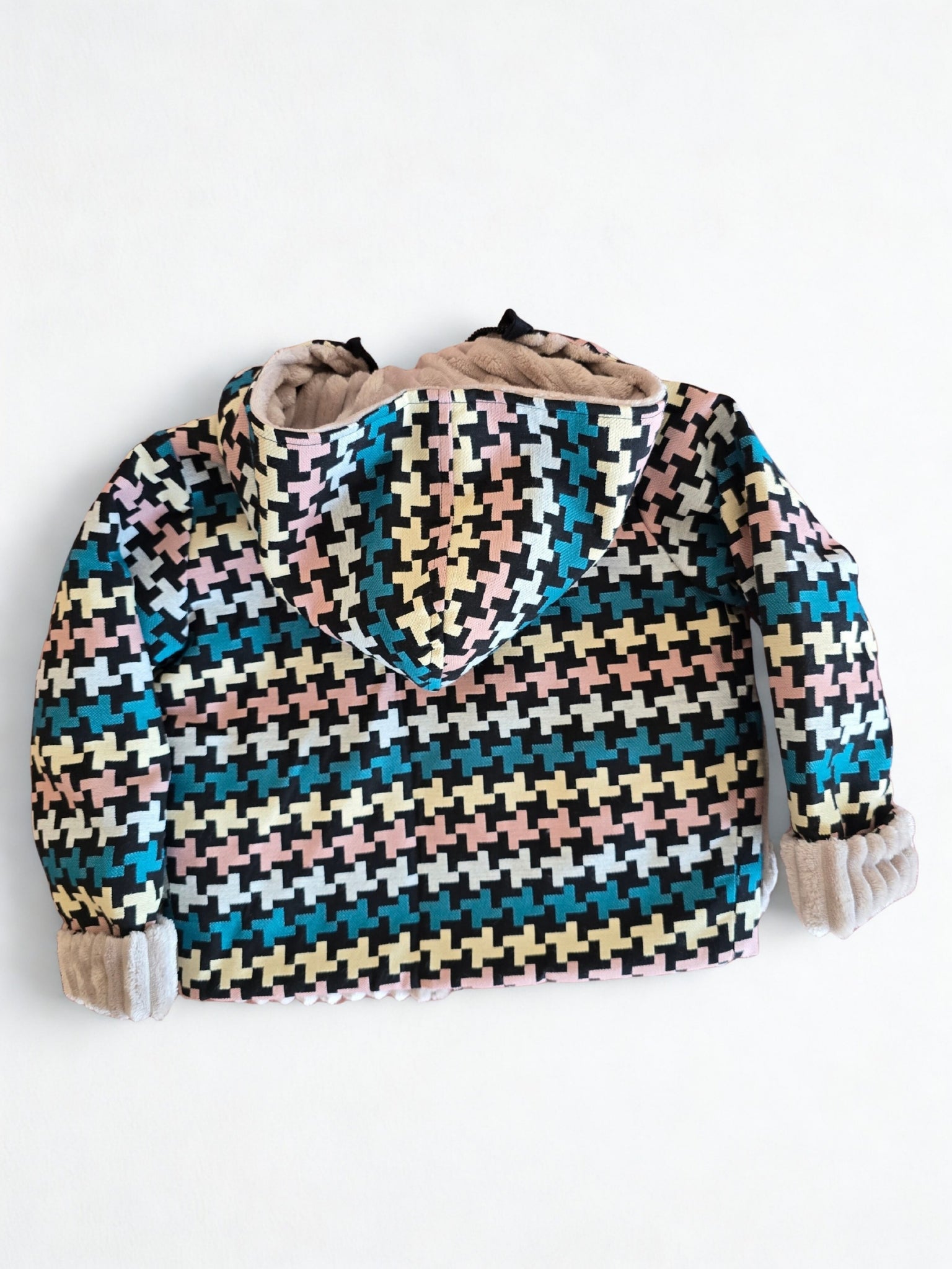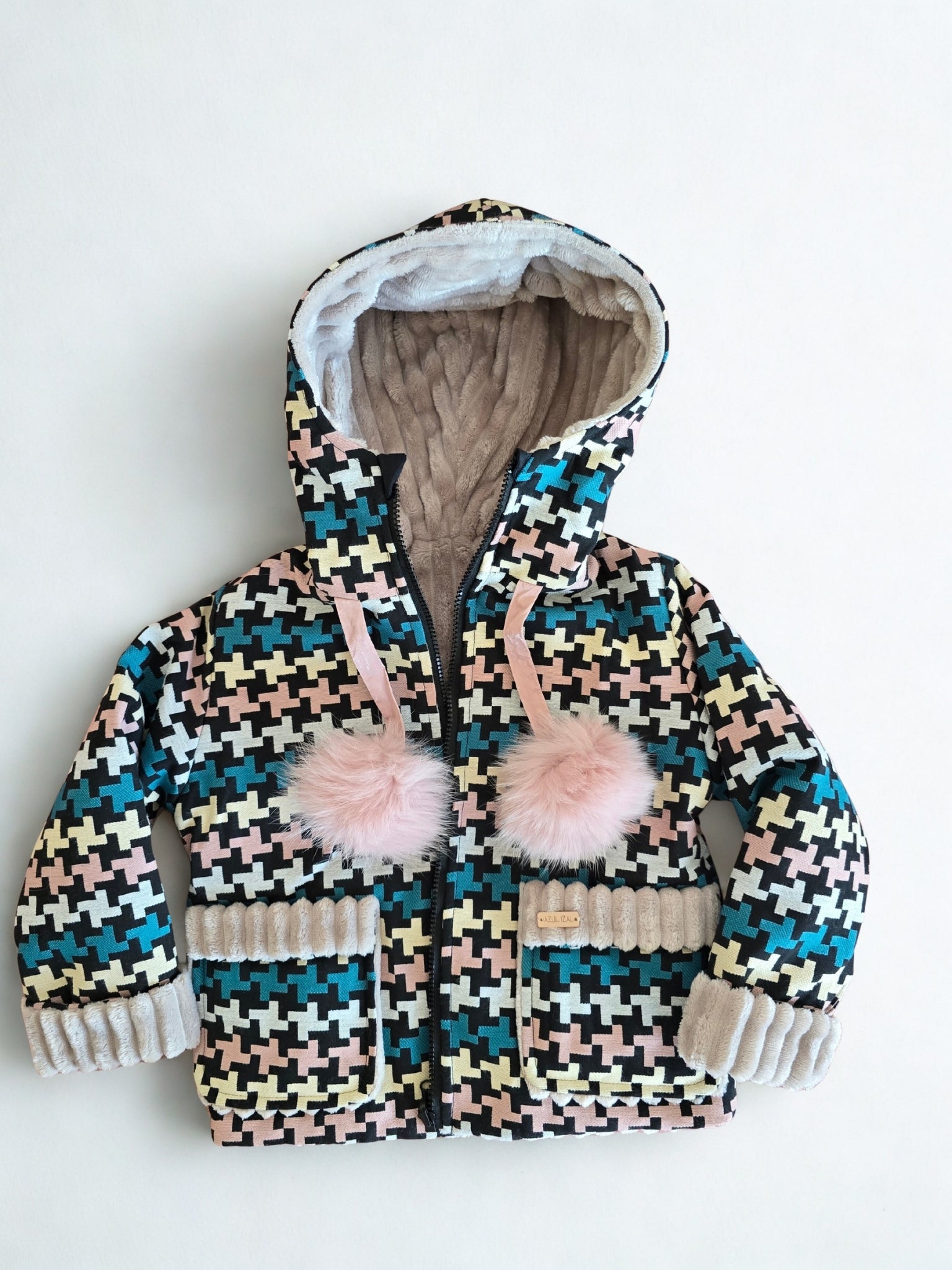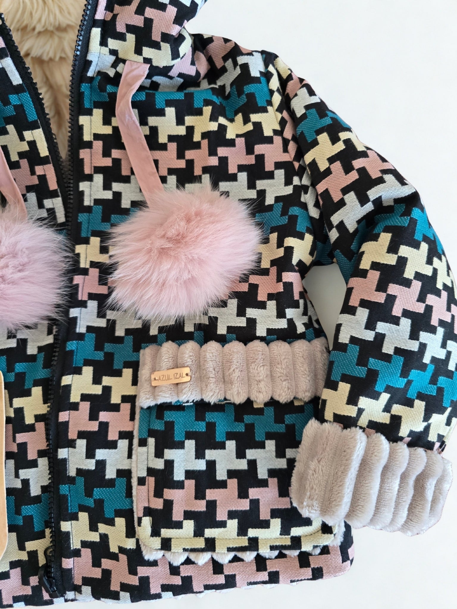 Vienoje pusėje – spalvingas raštuotas audinys mėlynos, rožinės, kreminės ir juodos spalvų derinyje, puoštas švelniomis detalėmis ir dviem žaismingais rožiniais meškėno kailio bumbulais.