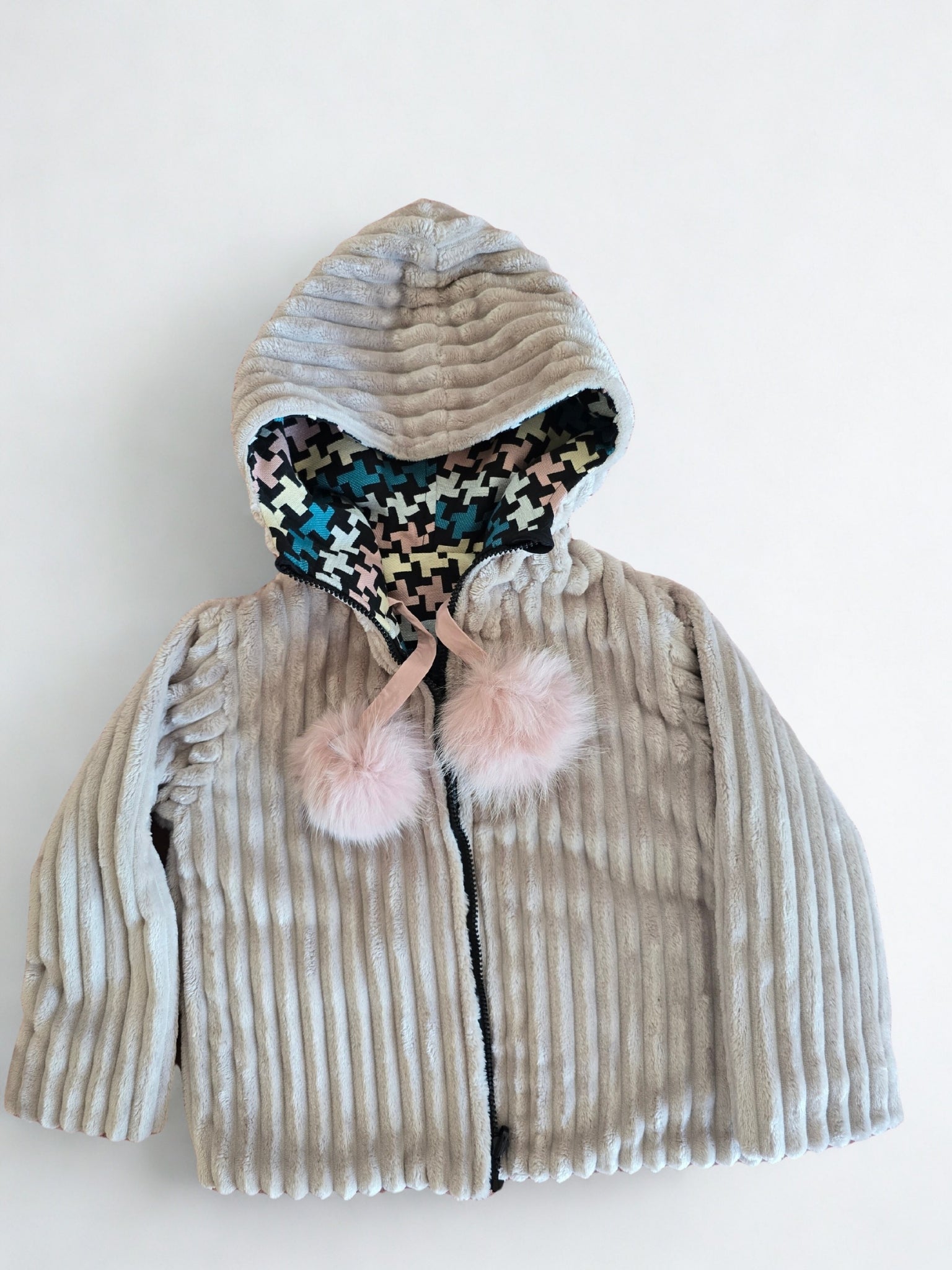 Dvipusė mergaitiška striukė su kapišonu ir rožiniais meškėno kailio bumbulais