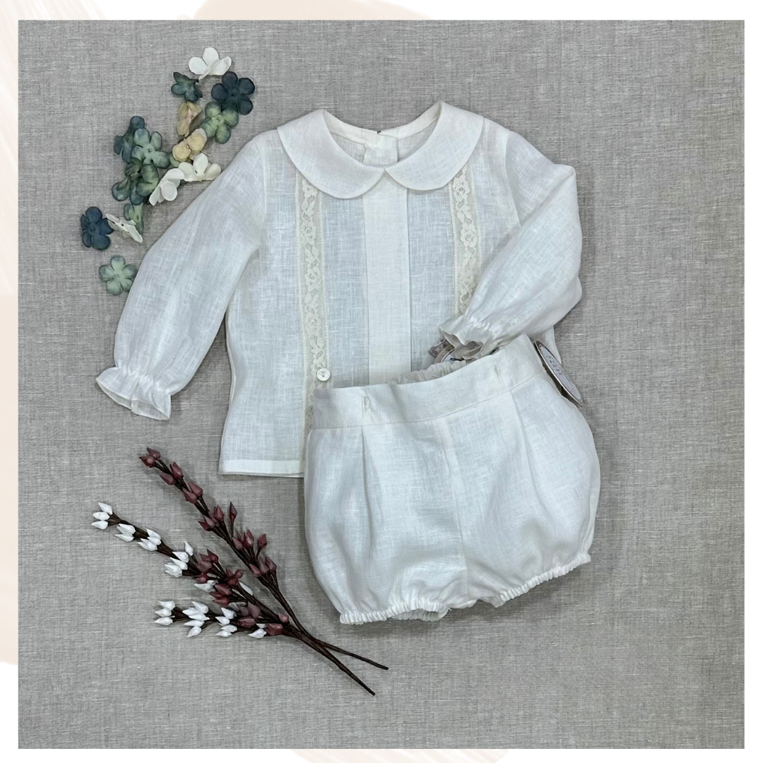Šis šventinis kostiumėlis, pasiūtas iš natūralaus 100 % lino, puikiai tinka krikštynoms ar kitoms ypatingoms progoms. Rinkinį sudaro ilgomis rankovėmis marškinėliai su dekoratyvinėmis nėriniais priekyje ir apvalia apykakle bei trumpi šortukai su gumelėmis klešnių apačioje. Klasikinis, švelniai baltas atspalvis suteikia subtilumo ir elegancijos.