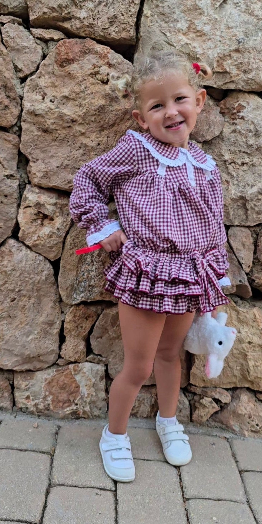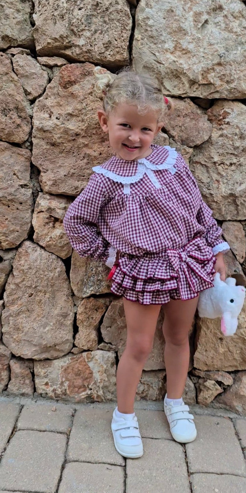 Žavingas komplektas mergaitei iš 100% poliesterio – bliuskutė ir kelnaitės su raukinukais. Abi dalys gali būti dėvimos kartu arba derinamos atskirai su kitais drabužiais, sukuriant vis naujus įvaizdžius.