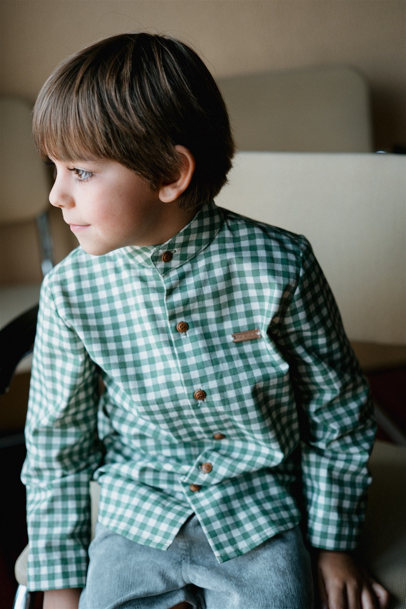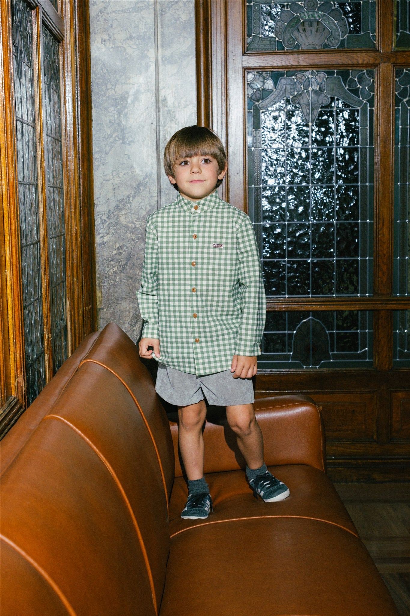 Berniukų komplektas, sudarytas iš ilgomis rankovėmis marškinių, pagamintų iš 100 % ekologiškos medvilnės, su žaliu „vichy“ langelių raštu, mao tipo apykakle ir sagų užsegimu priekyje, bei vienspalvių, patogaus kirpimo šortų. Šortai pagaminti iš 85 % poliesterio, 12 % poliamido ir 3 % elastano, suteikiančių patvarumo ir elastingumo. Puikiai tinka klasikiniam, patogiam ir universaliam įvaizdžiui.