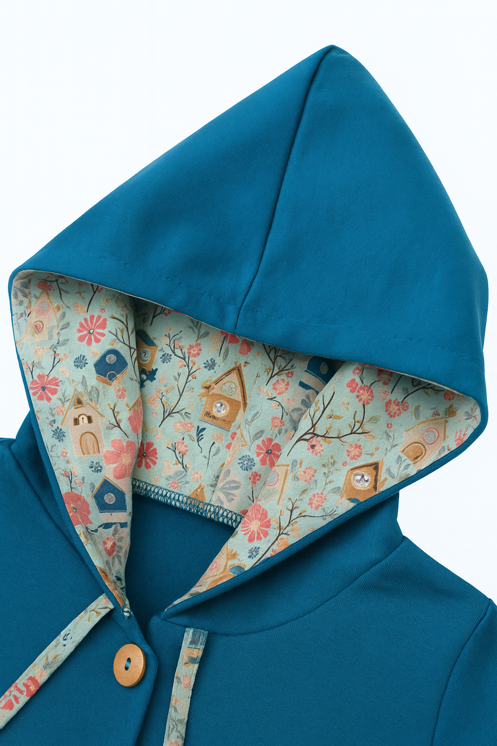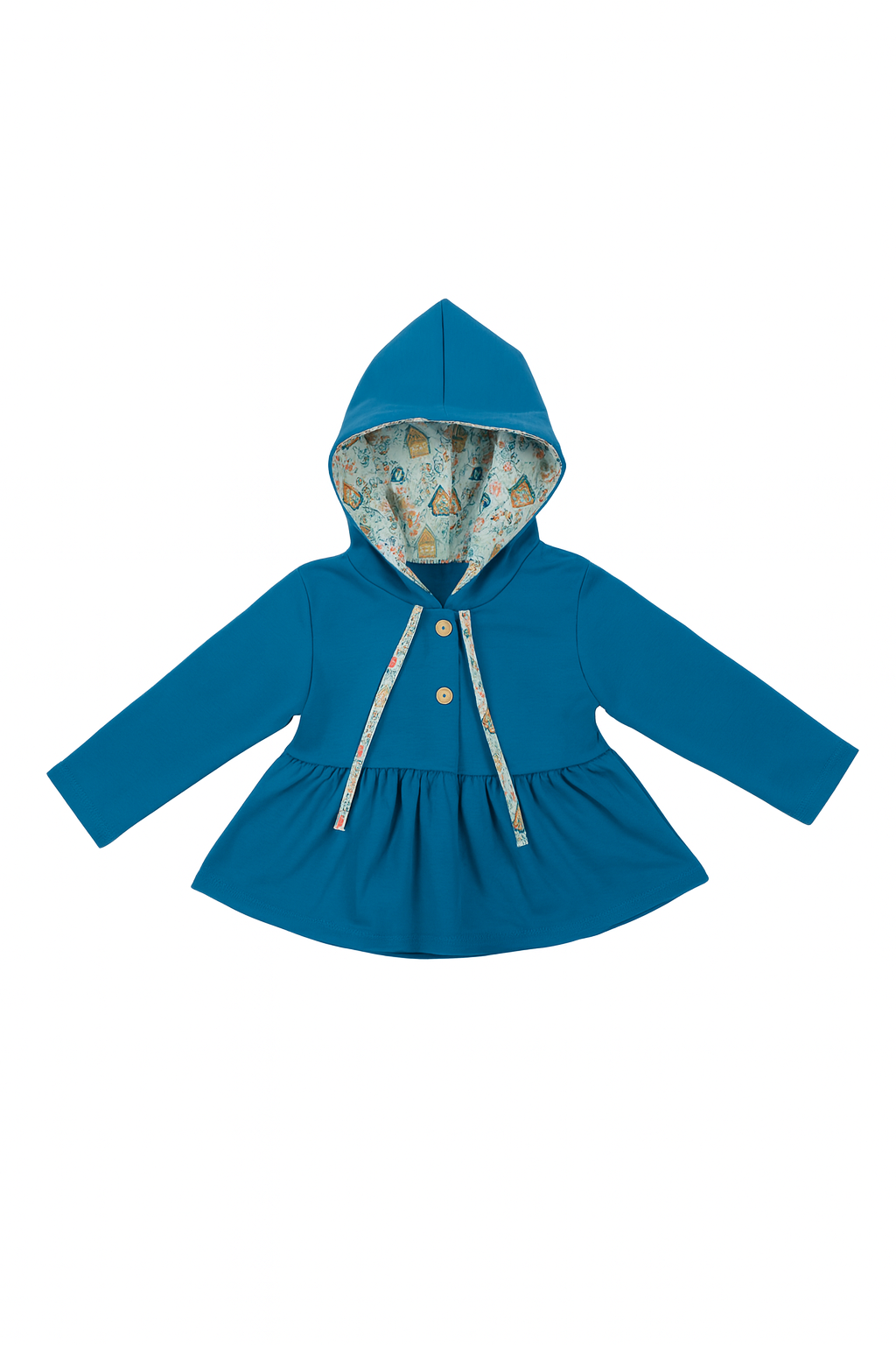 Mėlynas mergaitiškas džemperiukas su kapišonu. Pagamintas iš 50% medvilnės ir 50% poliesterio, su švelniu bei šiltu veliūru viduje – puikiai tinka vėsesniems orams. Kapišono vidus papuoštas nuostabiu gėlių raštu, suteikiančiu išskirtinio žavesio.