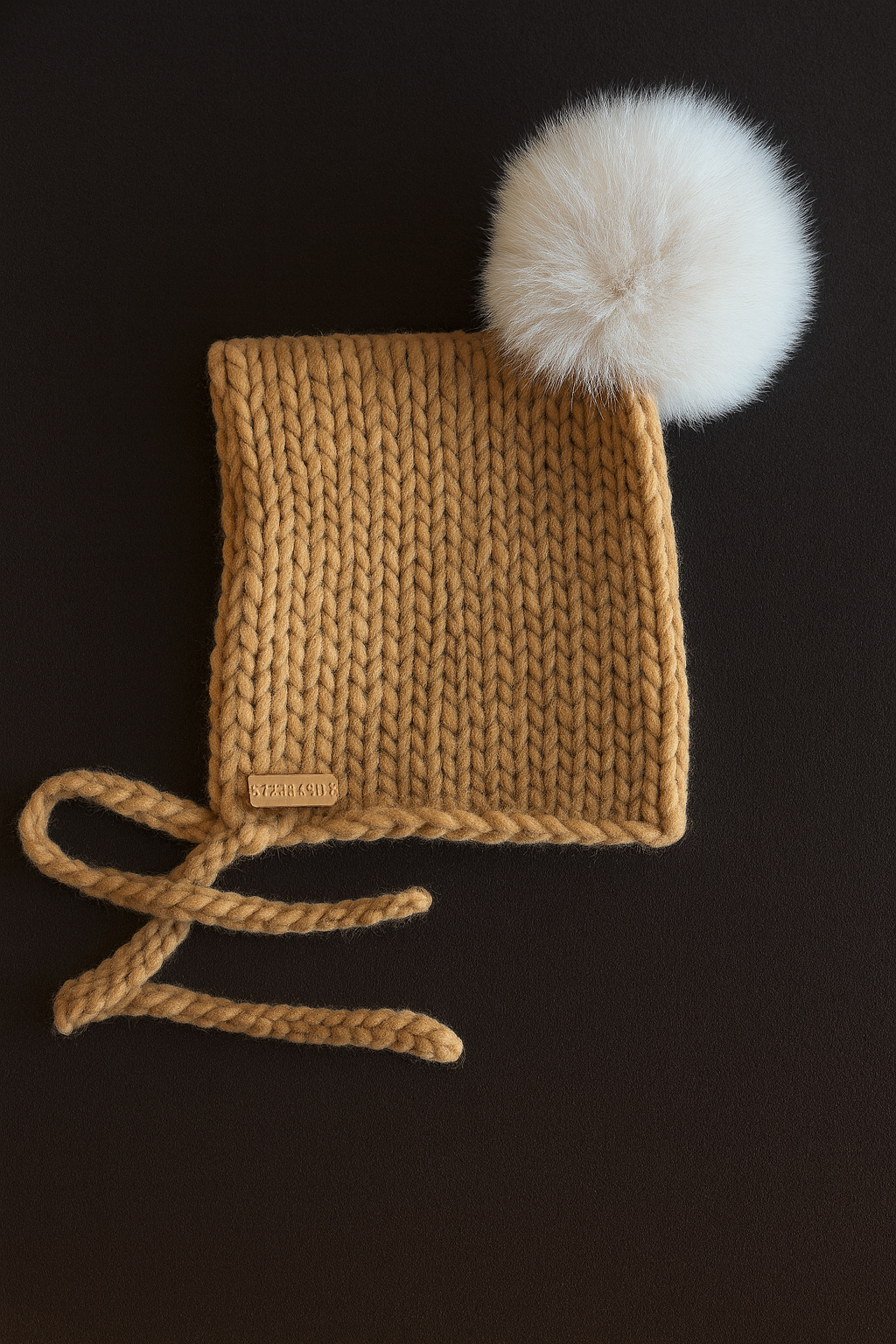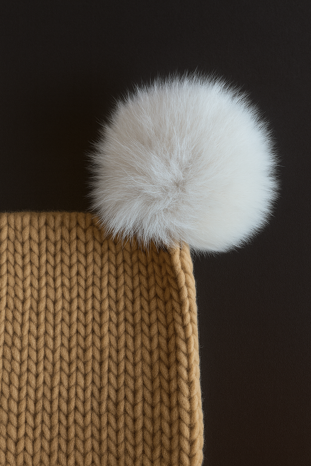 Rankų darbo kepurė, megzta iš švelnios merino vilnos. Smėlio spalvos modelis su vienu puriu, natūralaus meškenų kailio baltu bumbulu. Šilta, minkšta ir elegantiška kepurė - išskirtinės kokybės, sukurta iš tvarių medžiagų.