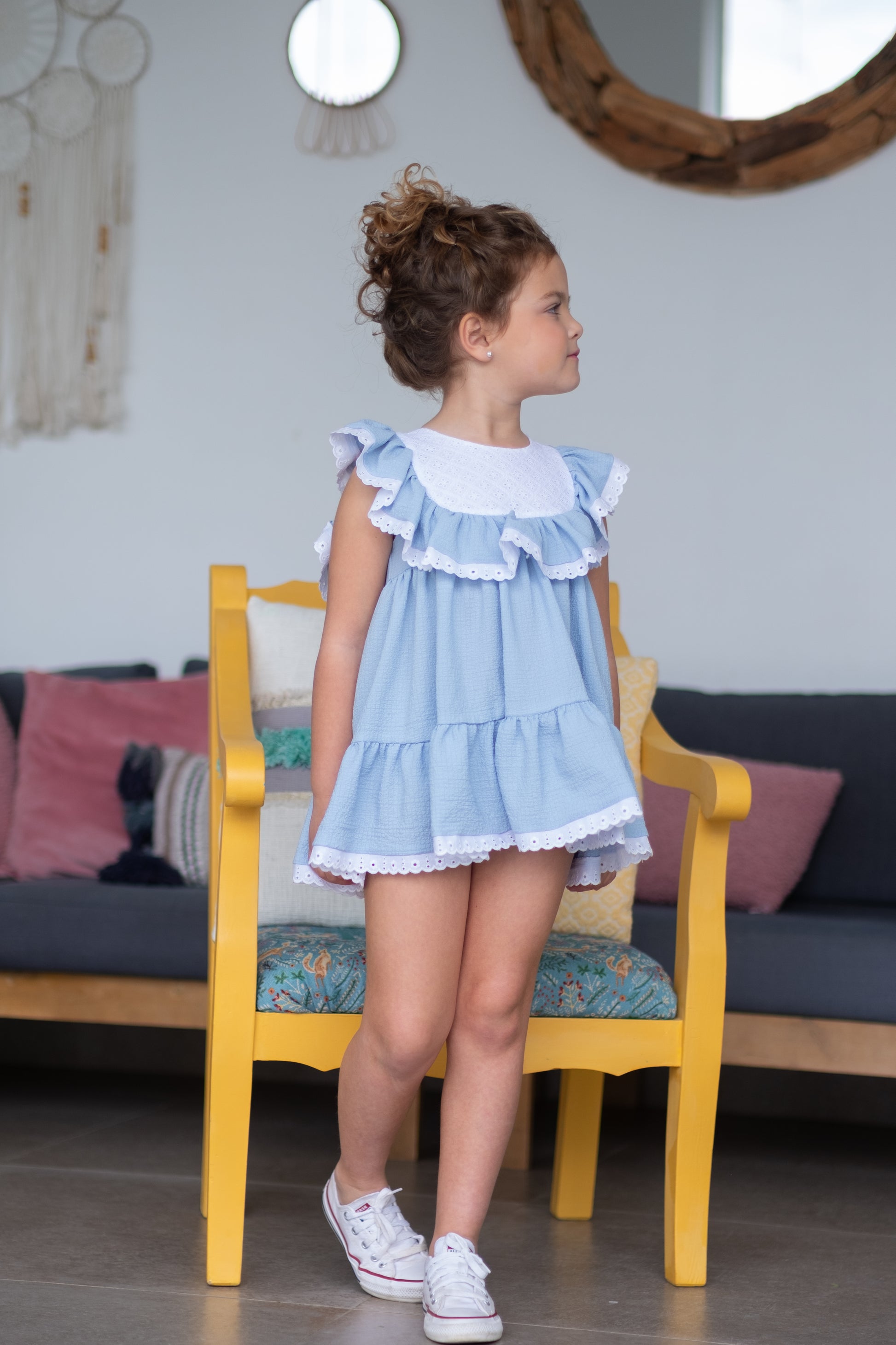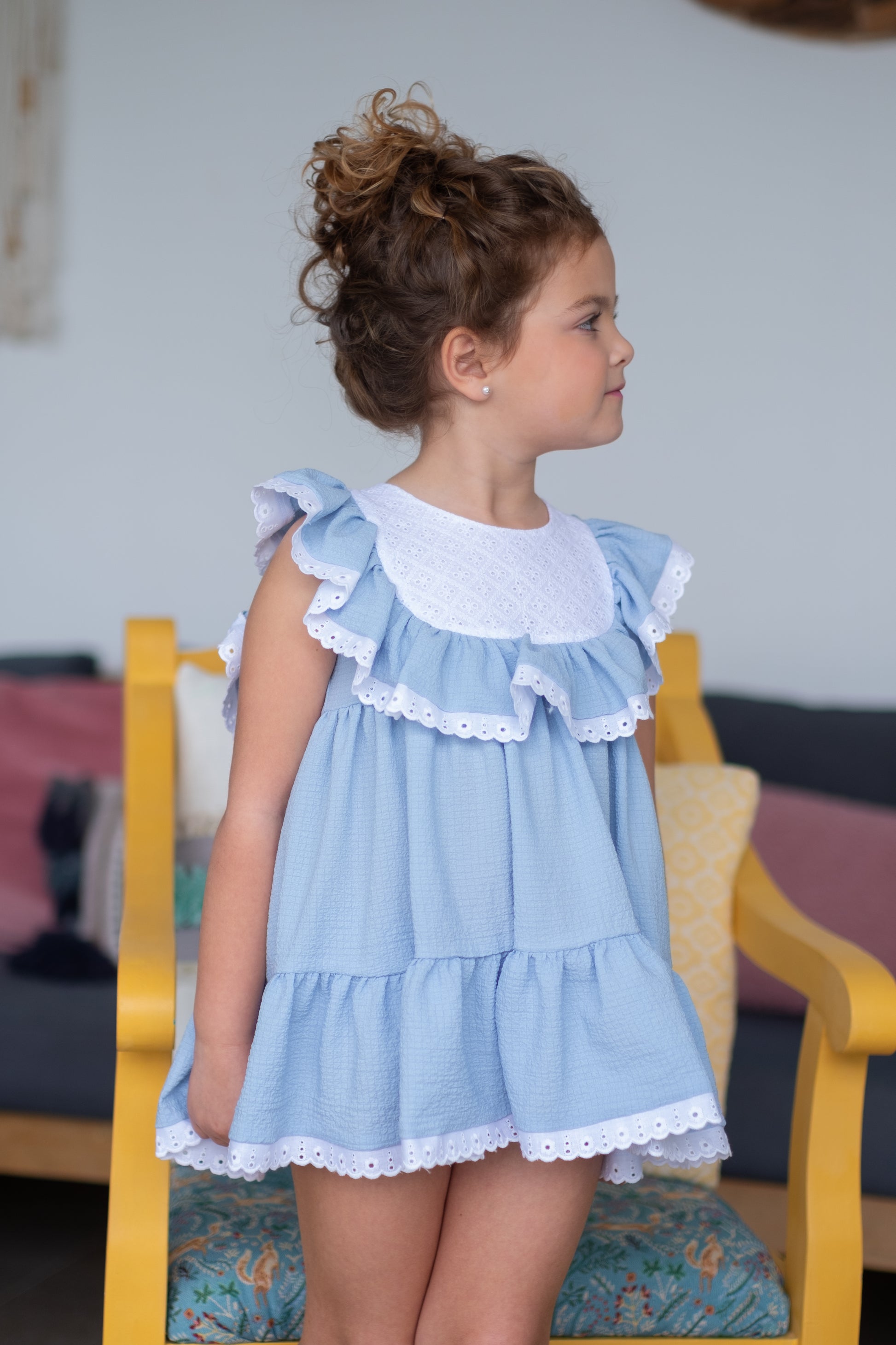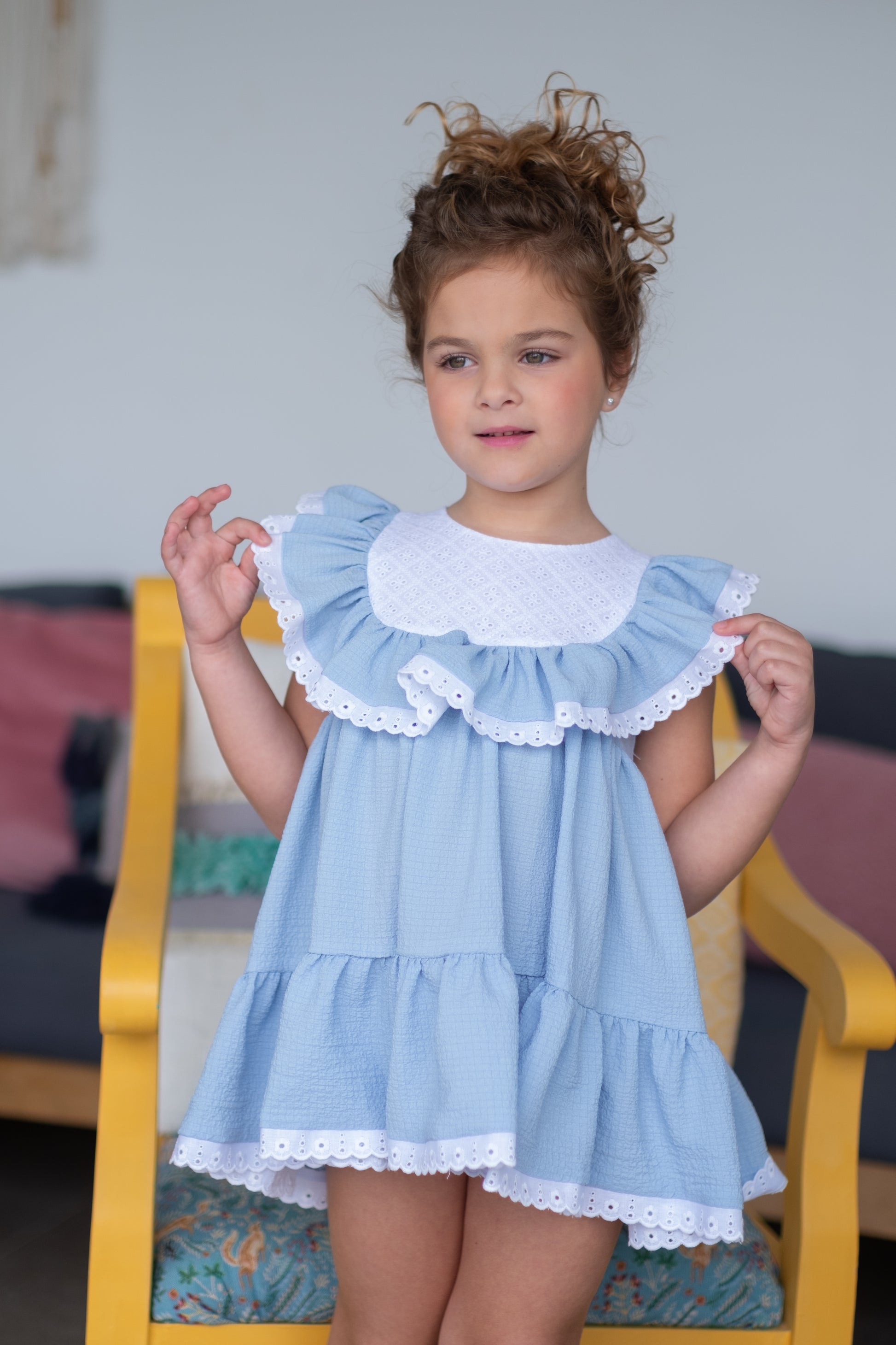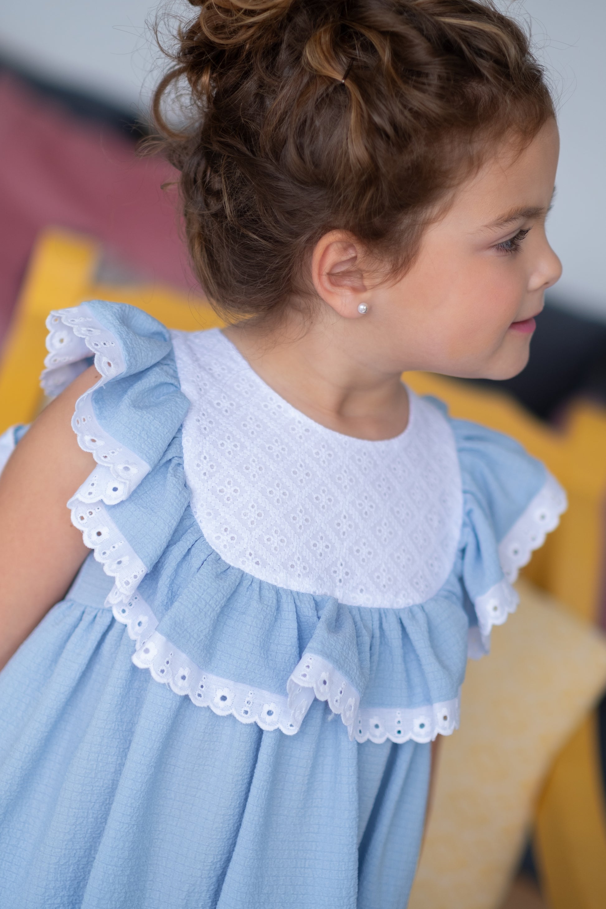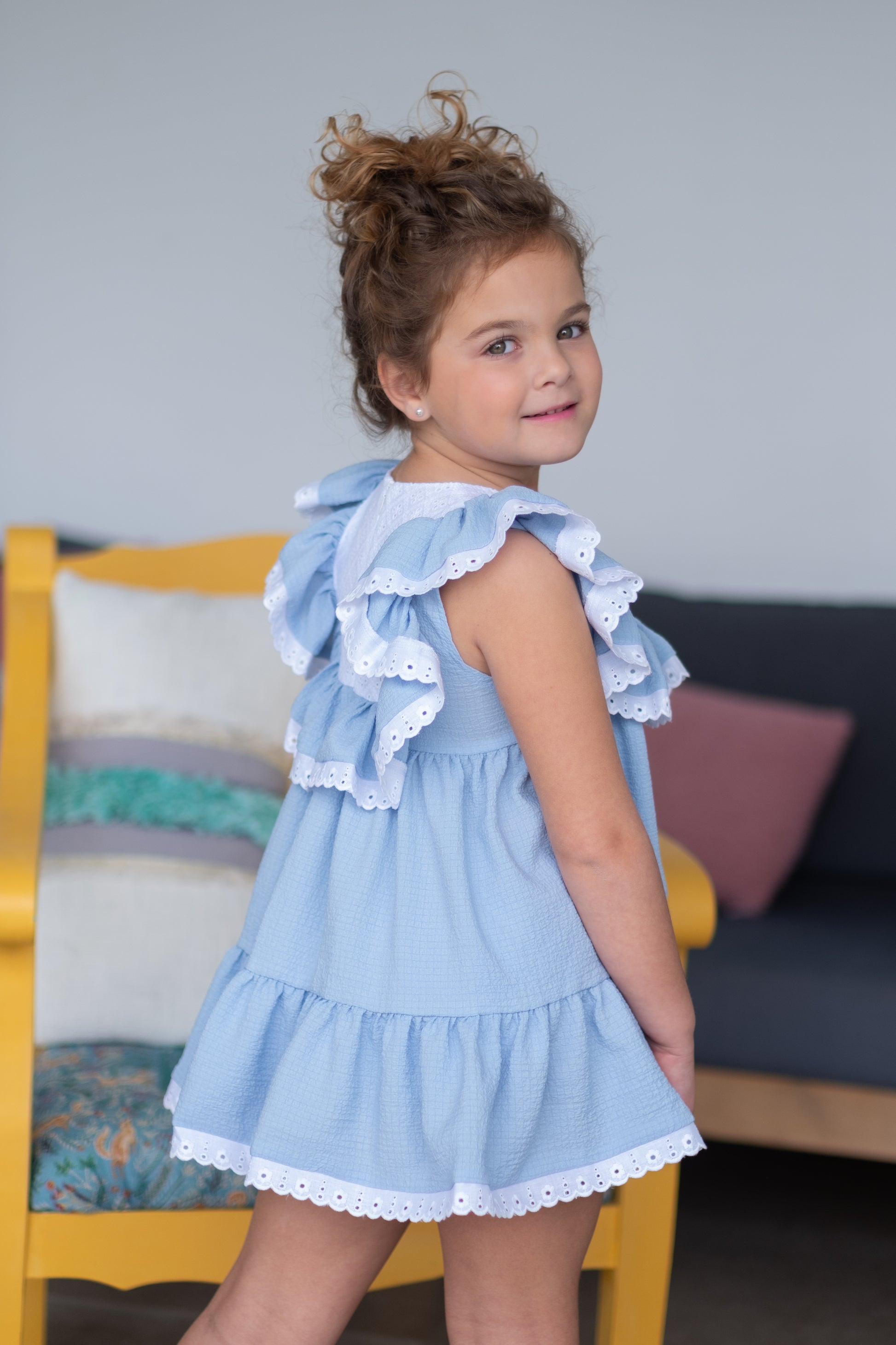 Siūta iš švelnaus šviesiai mėlyno audinio, ši suknelė išsiskiria subtiliais raukiniais ir baltais nėriniais, kurie suteikia klasikinių, laiko neįveikiamų detalių.