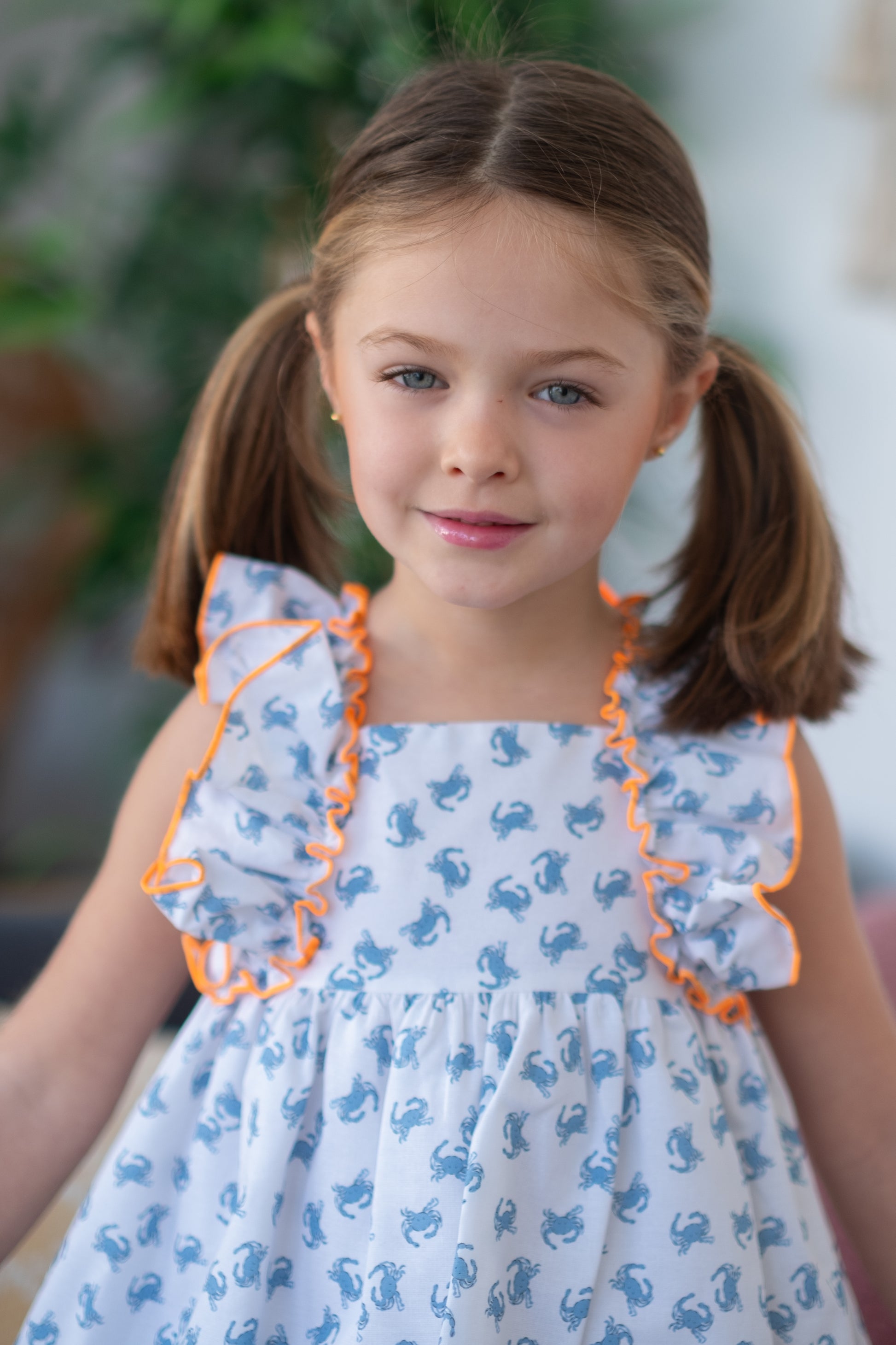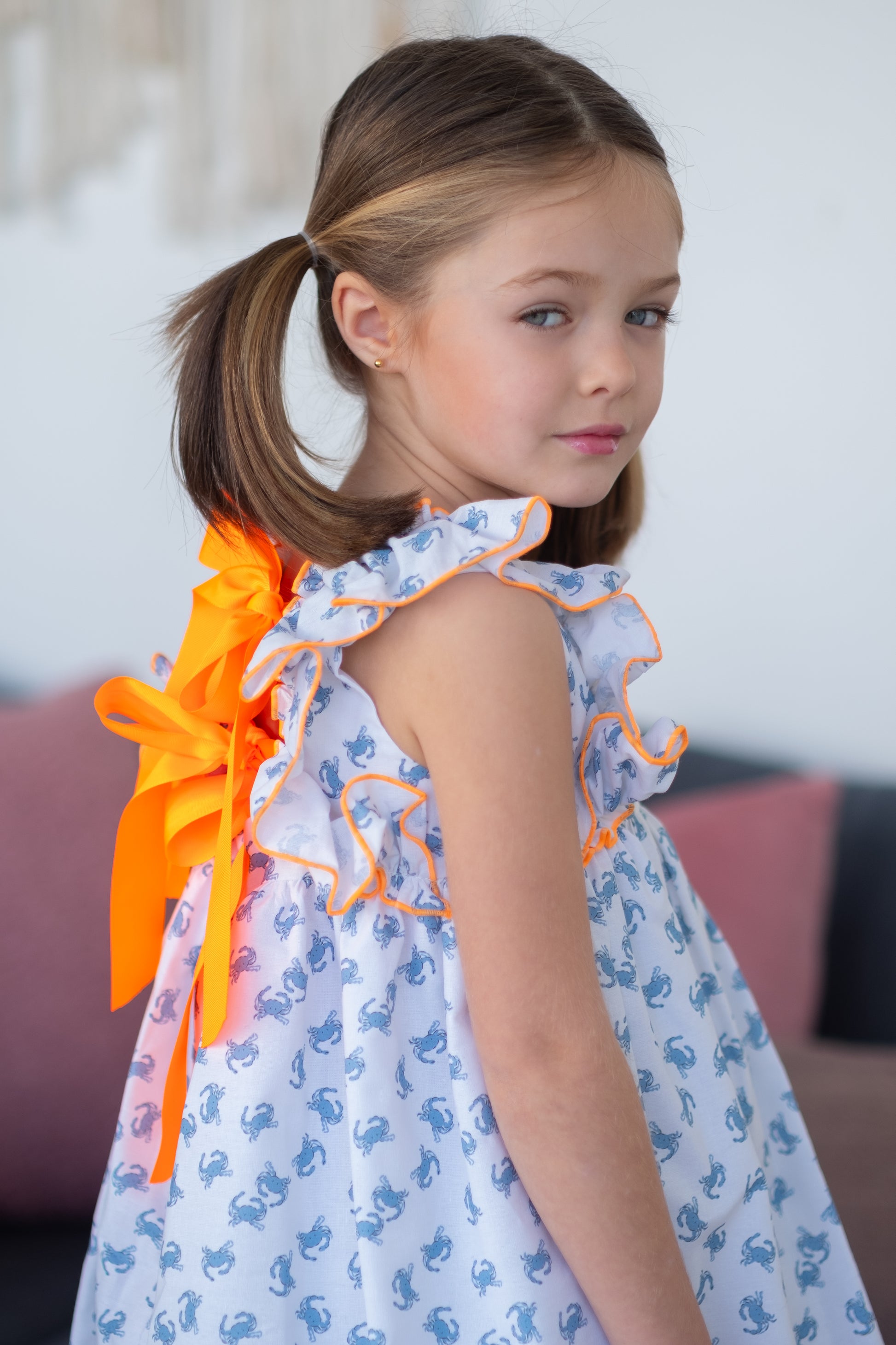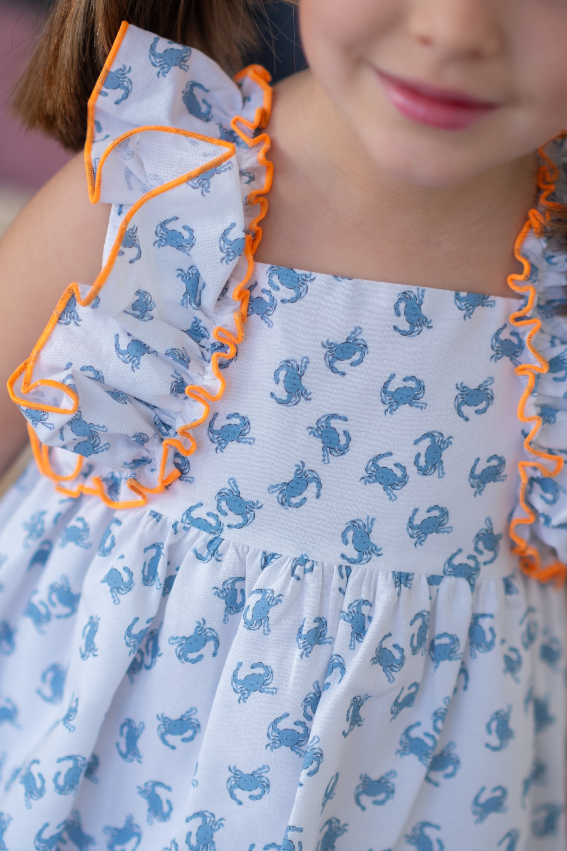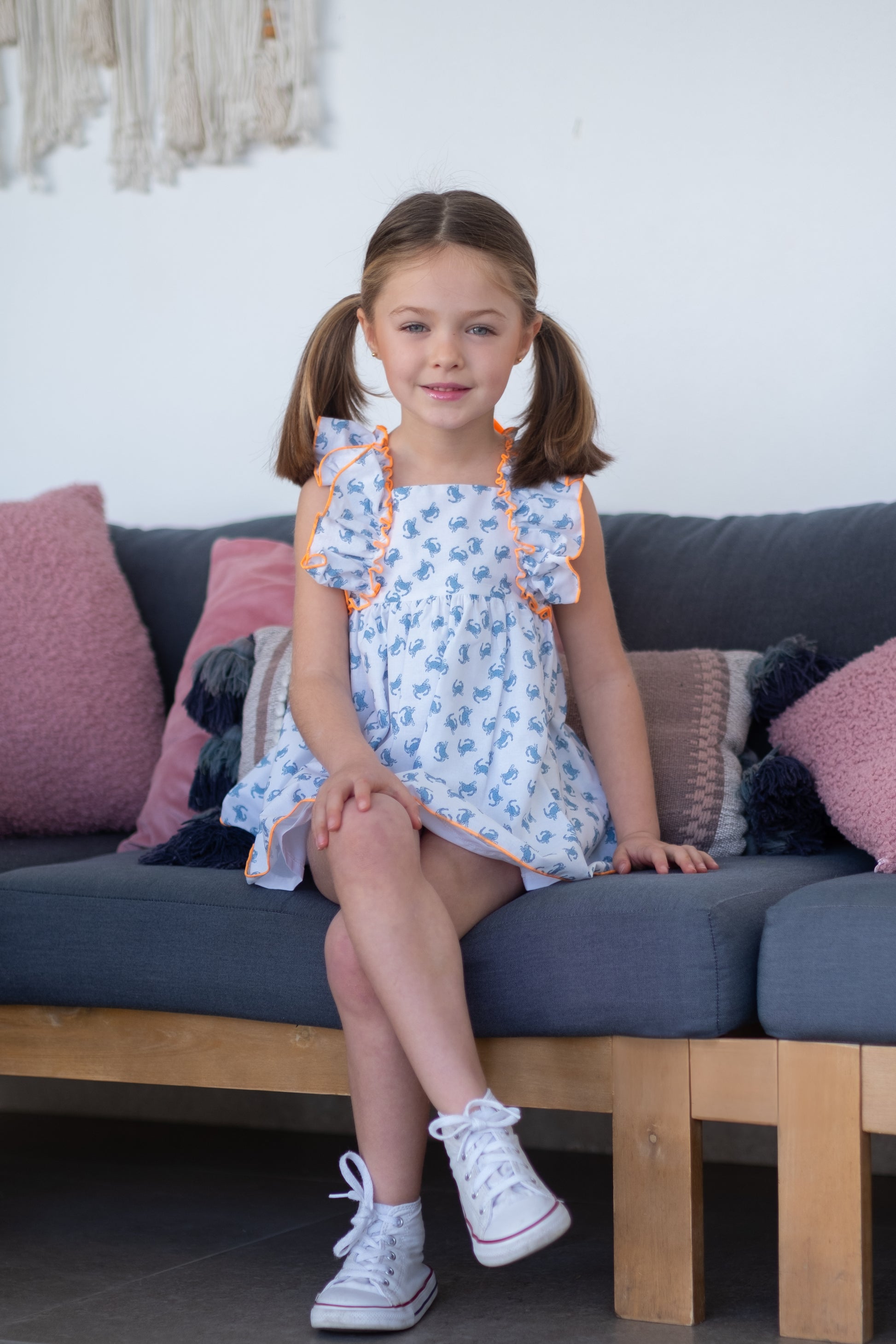 Ši žavinga vasarinė suknelė mergaitėms – tai puikus pasirinkimas šiltoms dienoms. Pagaminta iš lengvo ir kvėpuojančio audinio, ji pasižymi žaismingu krabų raštu bei ryškiomis oranžinėmis siūlėmis, kurios suteikia išskirtinumo. Raukinukai prie pečių ir lengvai krentantis siluetas leidžia vaikui laisvai judėti ir jaustis patogiai visą dieną. Derinkite su sportbačiais arba sandaliukais – tai idealus derinys žaidimams, pasivaikščiojimams ar šeimos išvykoms šventėms .