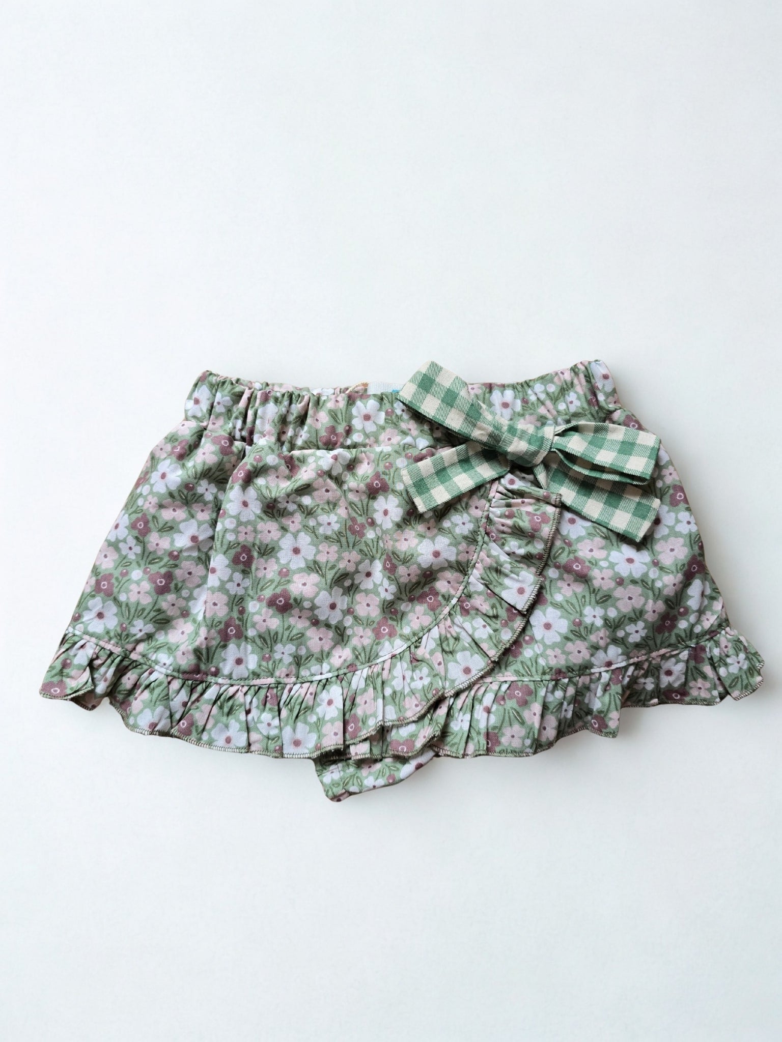 Sijonėlis, pagamintas iš 100 % medvilnės, su subtiliu gėlių raštu žalių ir rožinių atspalvių. Turi integruotas apatines kelnaites didesniam patogumui, raukinį apačioje ir dekoratyvinę „vichy“ rašto juostelę. Pagaminta Ispanijoje, puikiai tinka patogiems ir žavingiems deriniams.